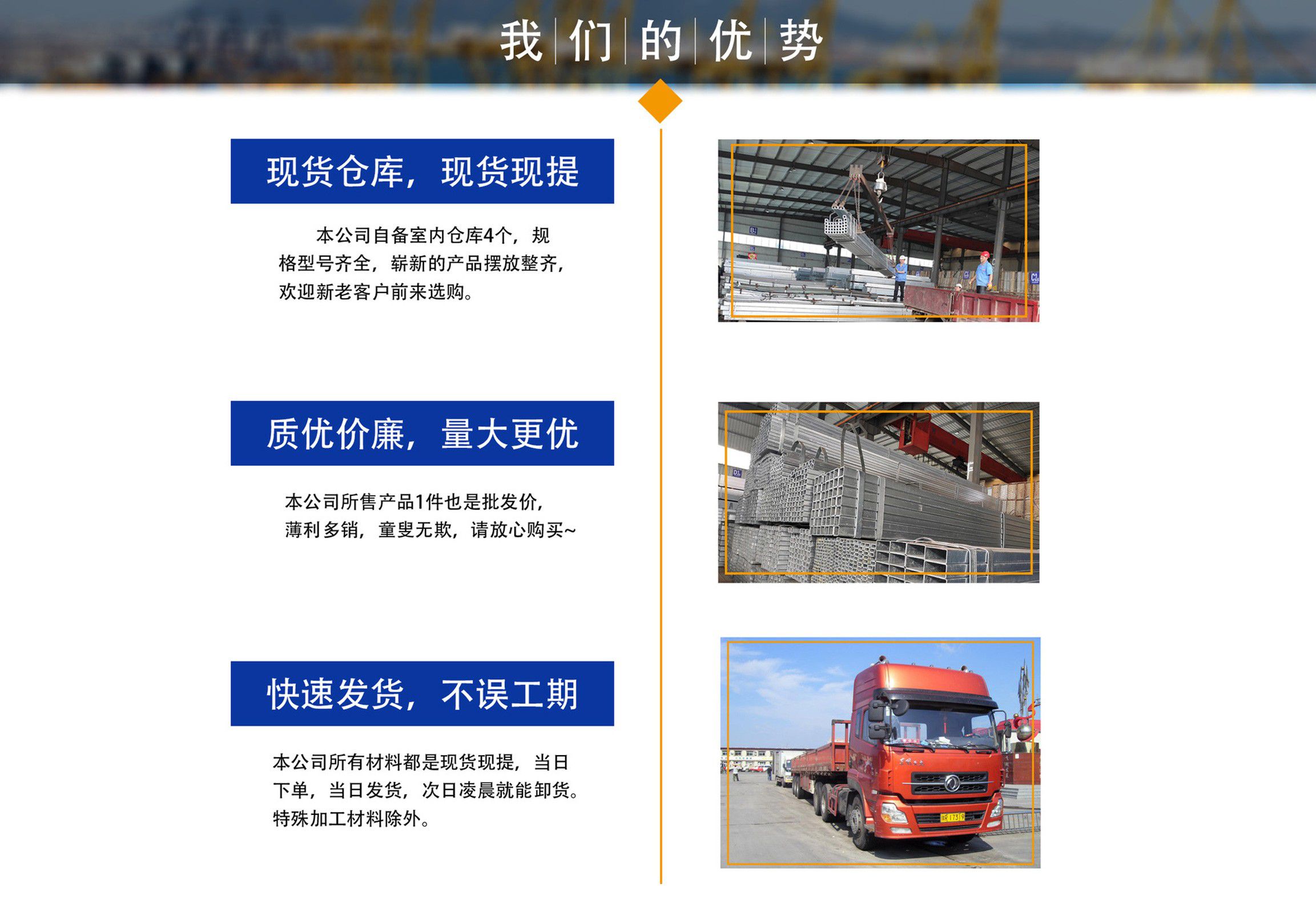 天津鍍鋅方管廠位于天津市靜海大邱莊工業區,交通便利,地理位置優(yōu)越。我廠占地面積近9000平方米,注冊資金1000萬元,主要從事鍍鋅方管,鍍鋅方矩管,熱鍍鋅方管,鍍鋅方管廠家等產品的生產及銷售,現生產設備已擴大到六條,年生產量十萬噸左右占地面積近兩萬平米。銷售網絡遍及全國,受到廣大用戶認可。公司恪守以誠信為本,立業為眾的經營理念,以可靠的質量、合理的價格、優(yōu)質的服務、卓絕的信譽、期待您的關注和支持。 公司庫存量大,材質規(guī)格齊全,沒有規(guī)格及特殊規(guī)格材質方管可及時定貨生產,我公司經營方式靈活,批零兼營、一支起售,并可為客戶辦理鐵路、公路運輸,7*24小時為您服務,歡迎新老客戶來電垂詢。 公司一直堅持“以質量求生存,以產品求發(fā)展,以信譽保合作,以服務贏客戶”的經營方針,客戶遍及大江南北,獲得了良好的聲譽與回報,在以后的發(fā)展歷程中,我們愿與廣大客戶攜手并進,共創(chuàng)輝煌。 熱忱歡迎新老客戶蒞臨指導、洽談業務!...